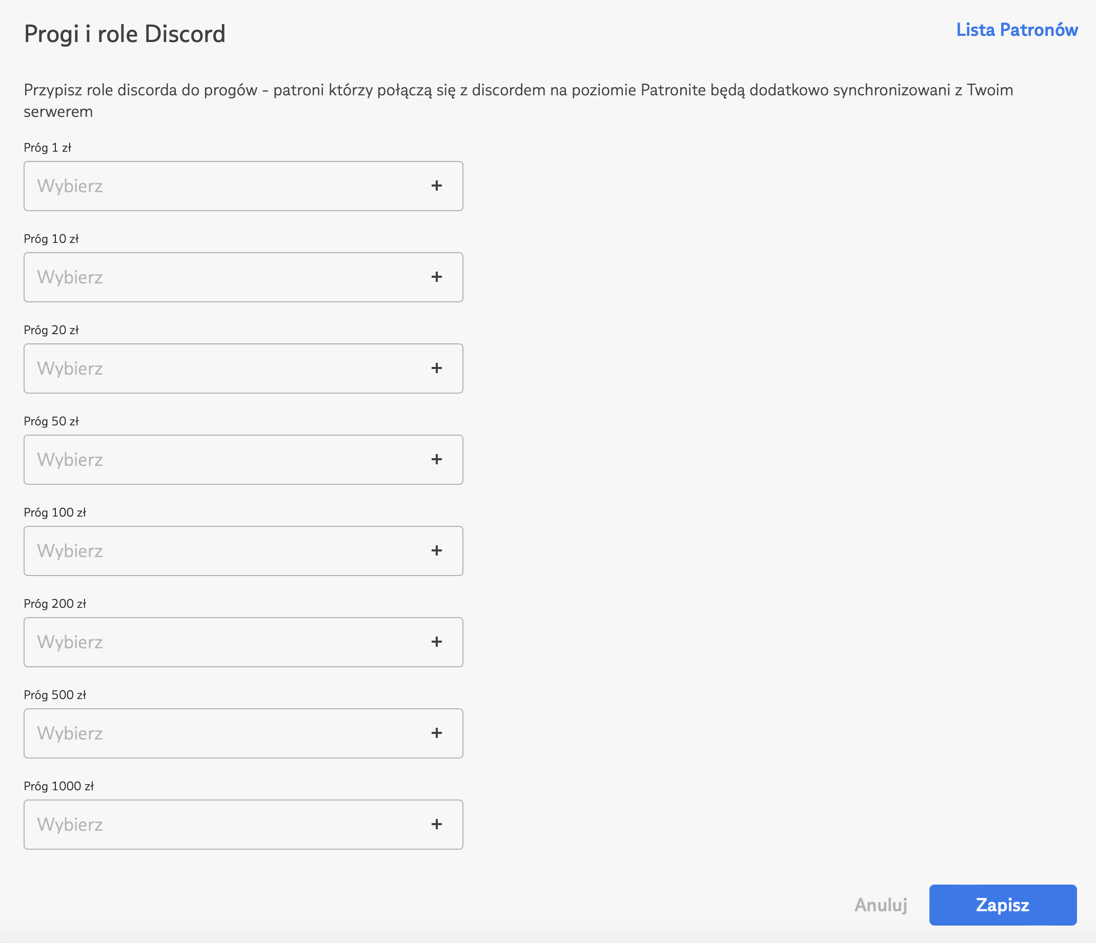 W tej zakładce możesz przypisać role, które zostaną automatycznie nadane Patronom wspierającym Cię w wybranych progach. Pamiętaj, że możesz przypisać do progu więcej niż jedną rolę!